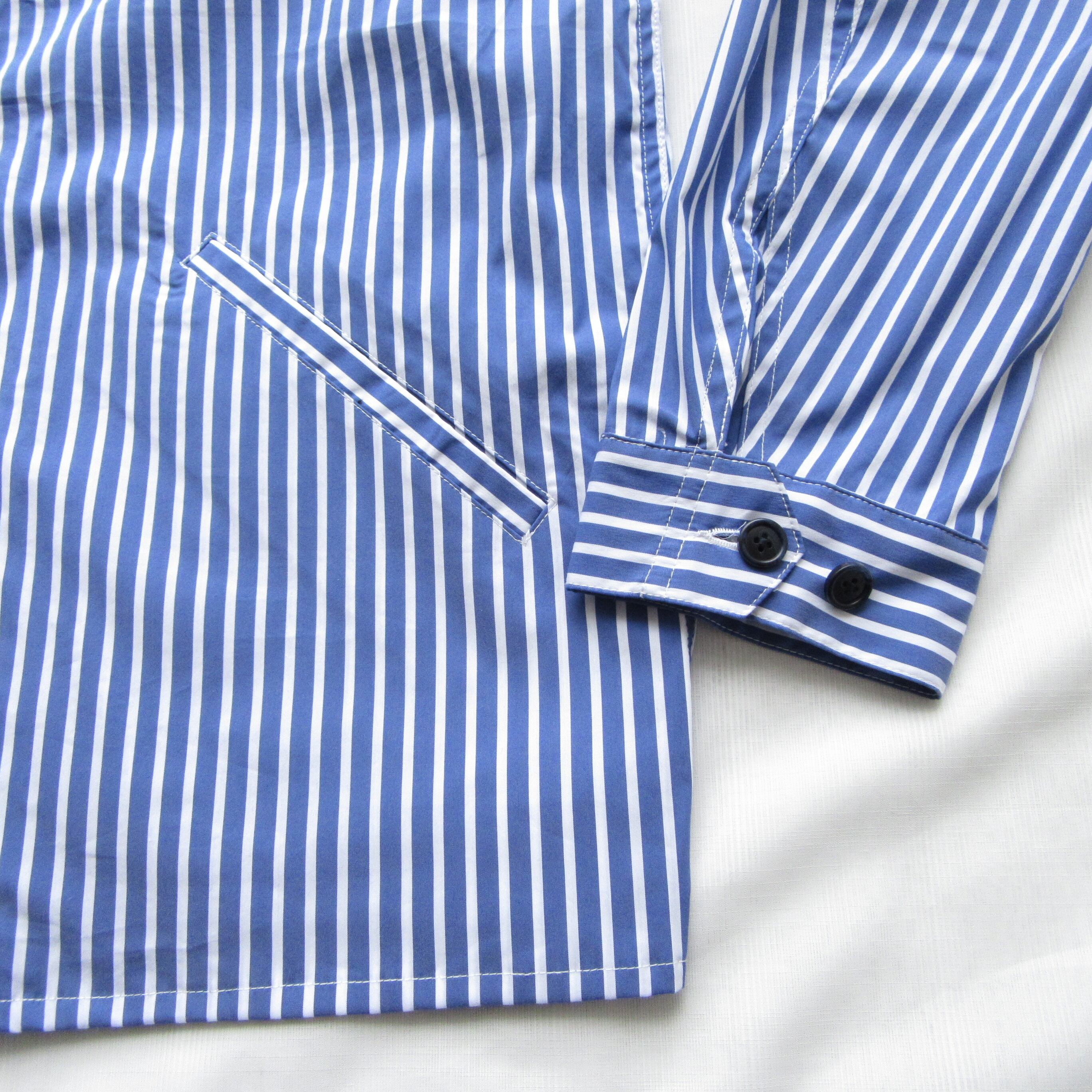 ストレッチポプリンというシャツ生地を使用し薄手で軽量なジャケットに仕上げています。通常のハリントンジャケットに見られるリブのデザインを排して、シャツに近いデザインとなっています。