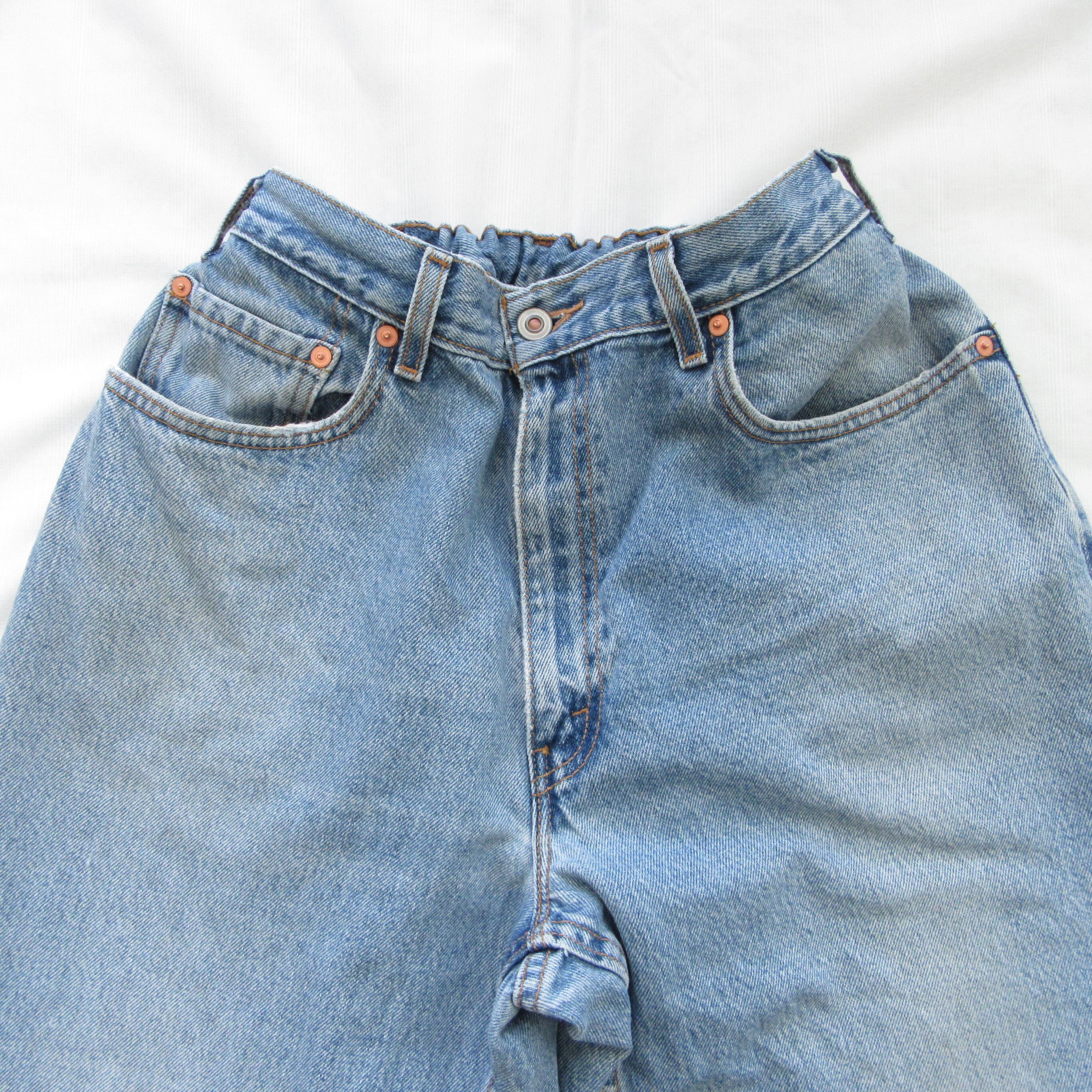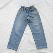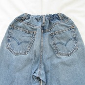 ヴィンテージデニムの中でも手に入りやすい大き目のサイズをリメイクしており、ウエストにゴムを入れてイージーパンツ仕様にしております。