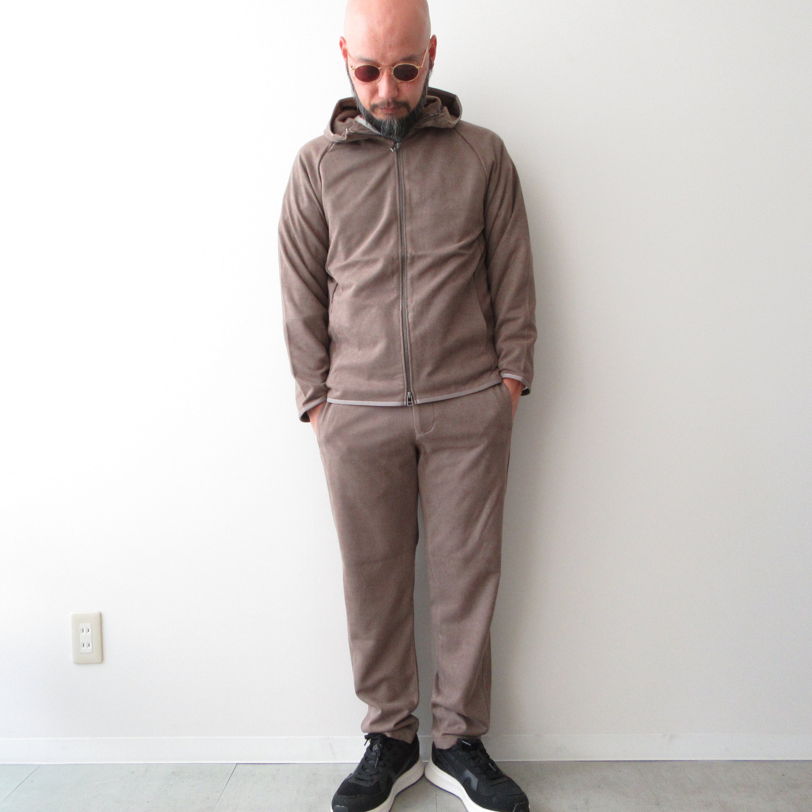 コーデュロイとスウェードを合わせたような手触りのサスティナブルスウェード生地。やわらかな起毛感としっとりとした手触り、裏地はジャージ素材となっているためストレッチ性もあり軽い着心地となっています。