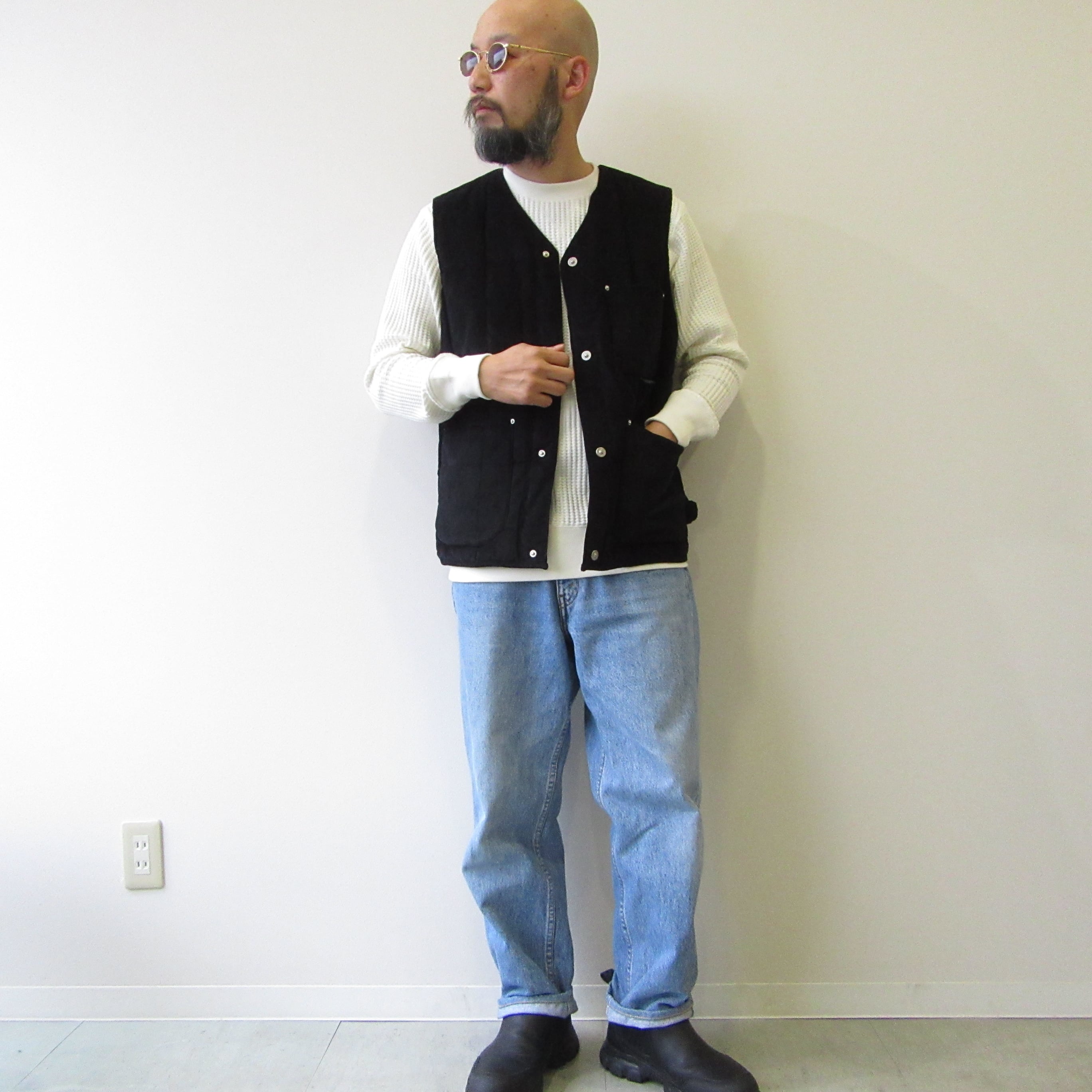TAION Vネックコーデュロイダウンベスト ブラック