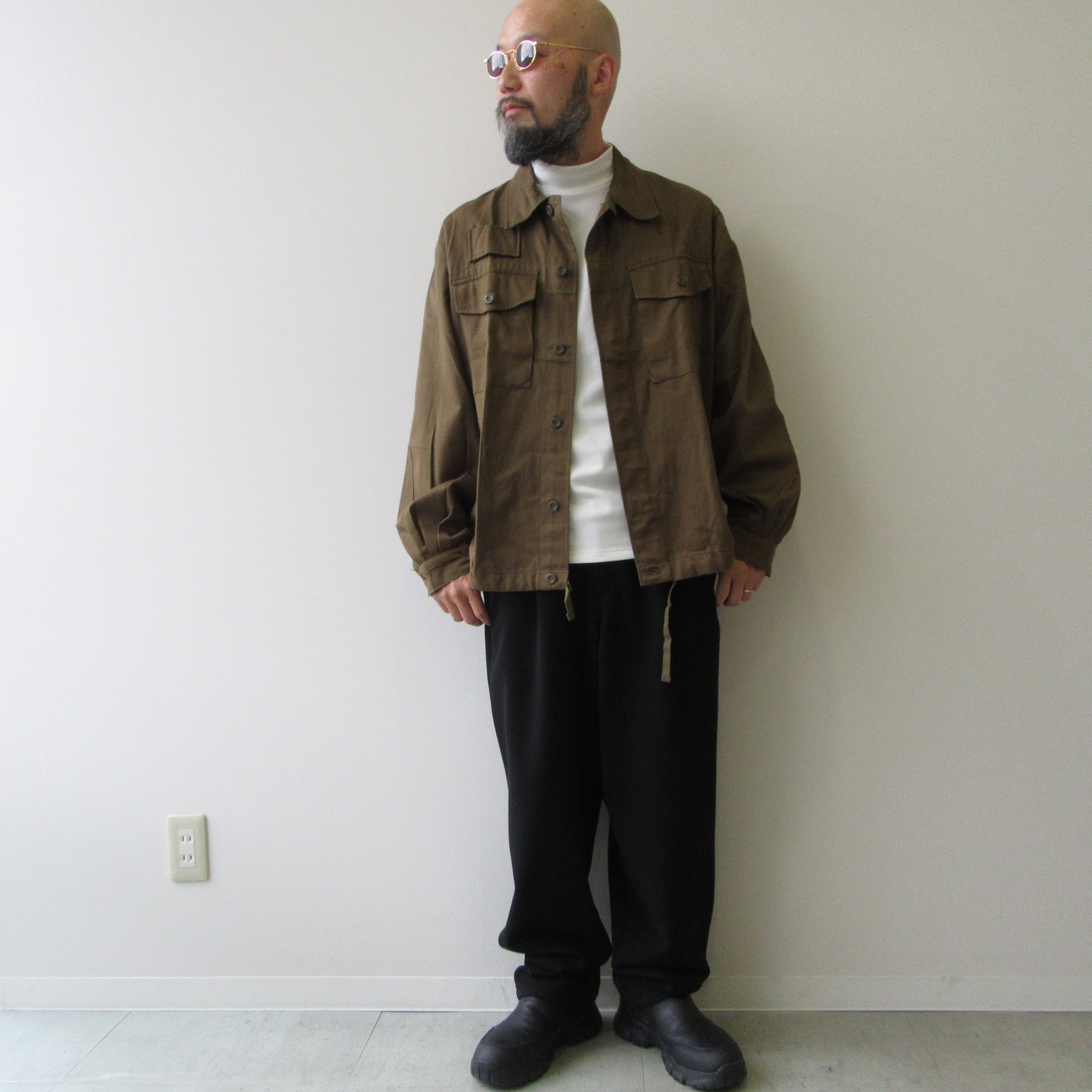 ウエストはバックシャーリングでワンタック入りのゆったりと穿けるほどよいルーズさと、砕けすぎないようわずかに裾に向かってテーパードシルエットとなっており、コーディネートの際にバランスのとりやすいシルエットとなっています。