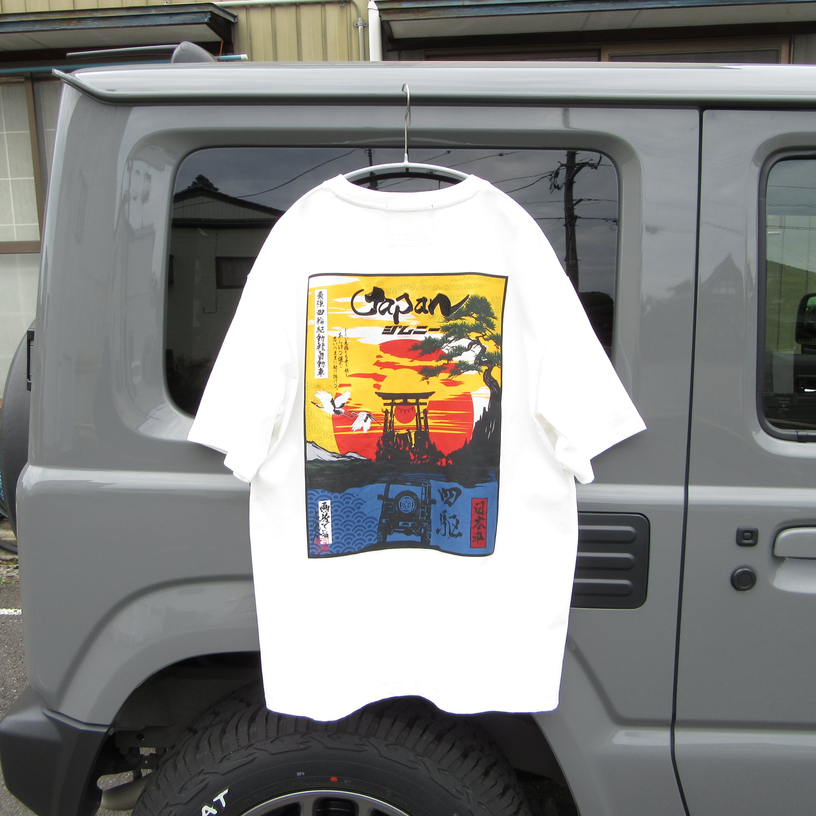 松・鶴・鳥居など日本画をイメージさせるデザインで夕日に向かって走るジムニーを描いています。