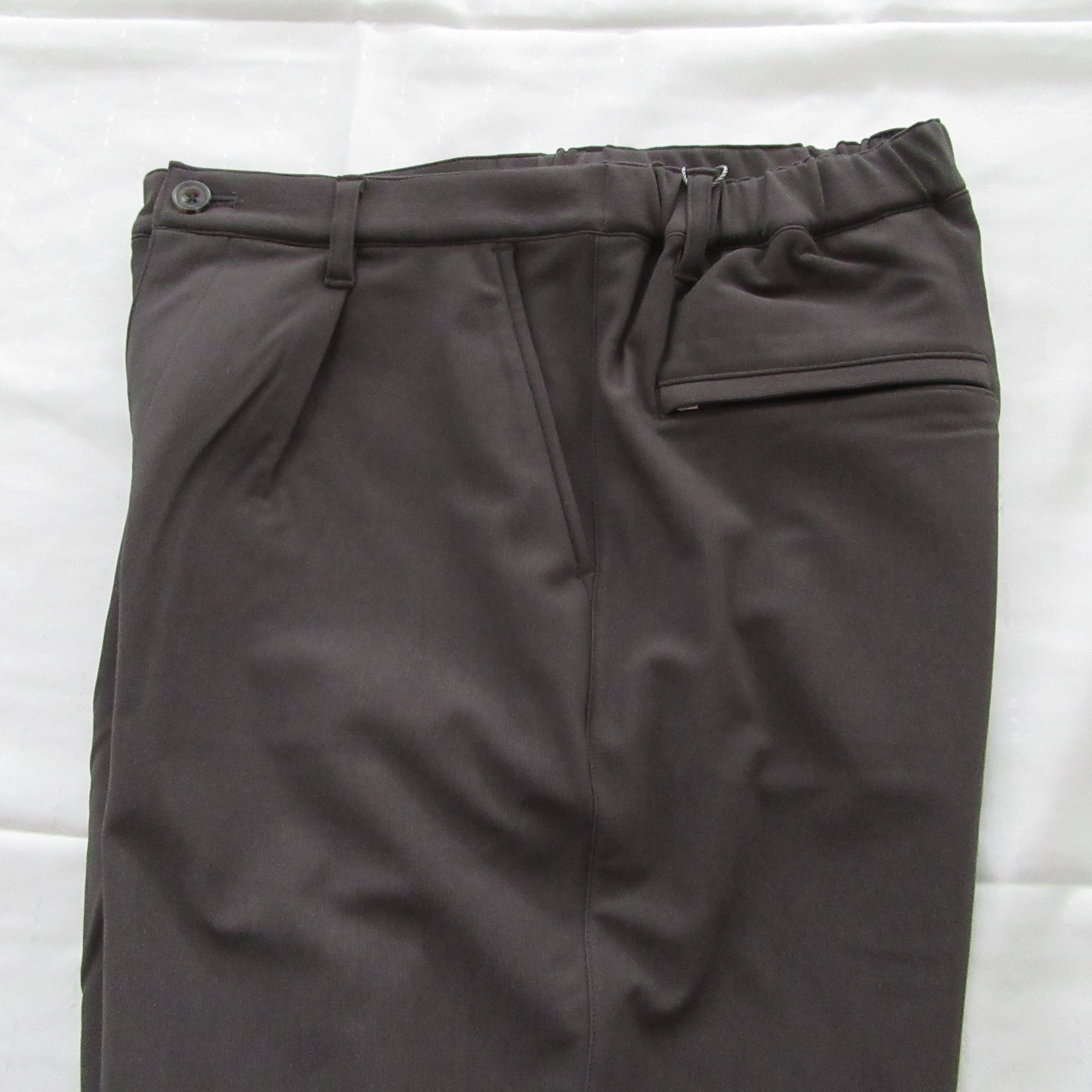 シャーリングの入ったウエストとワンタック入りのワイドシルエットでストレッチ性もあるため楽に穿けるうえに上品な見た目の生地感を備えています。