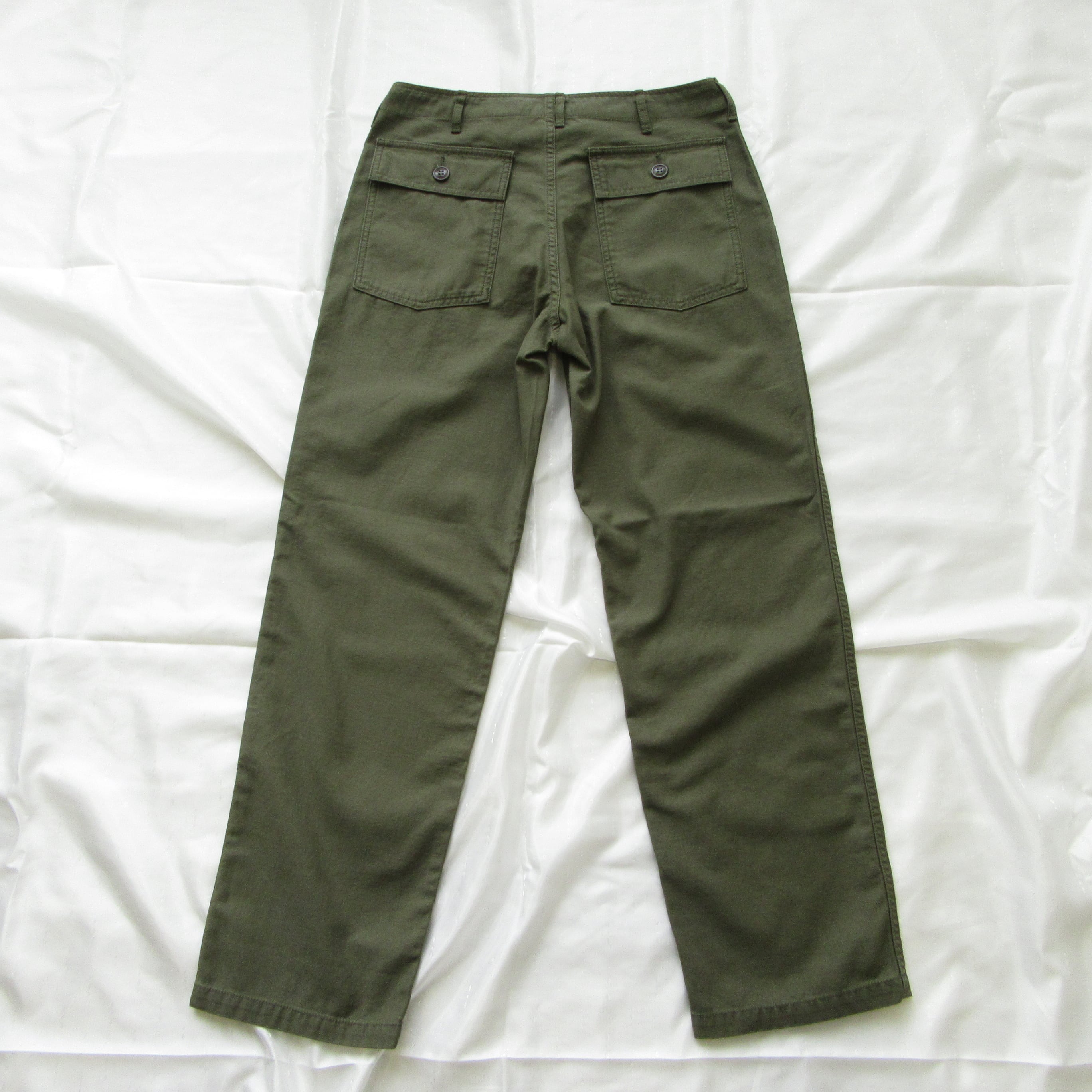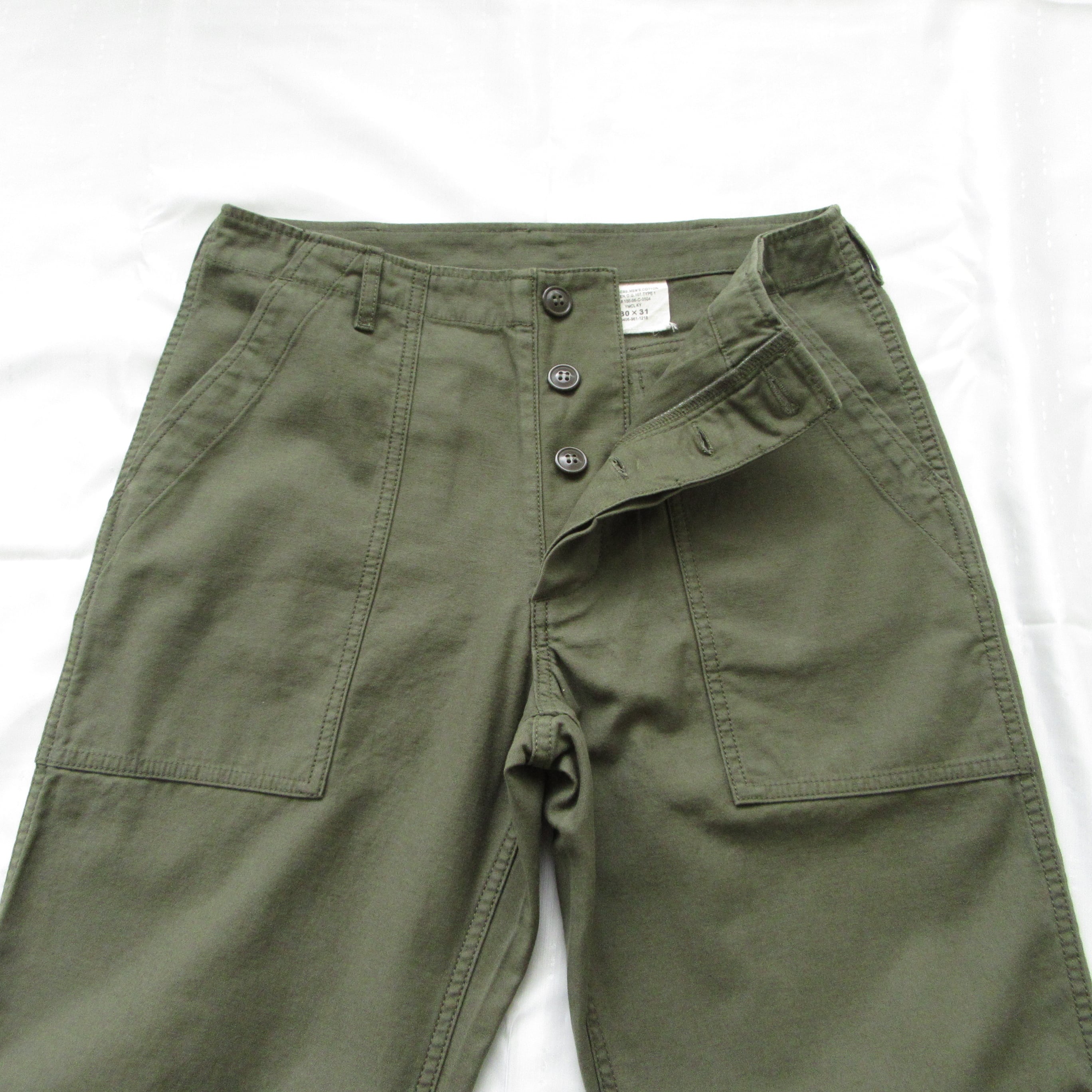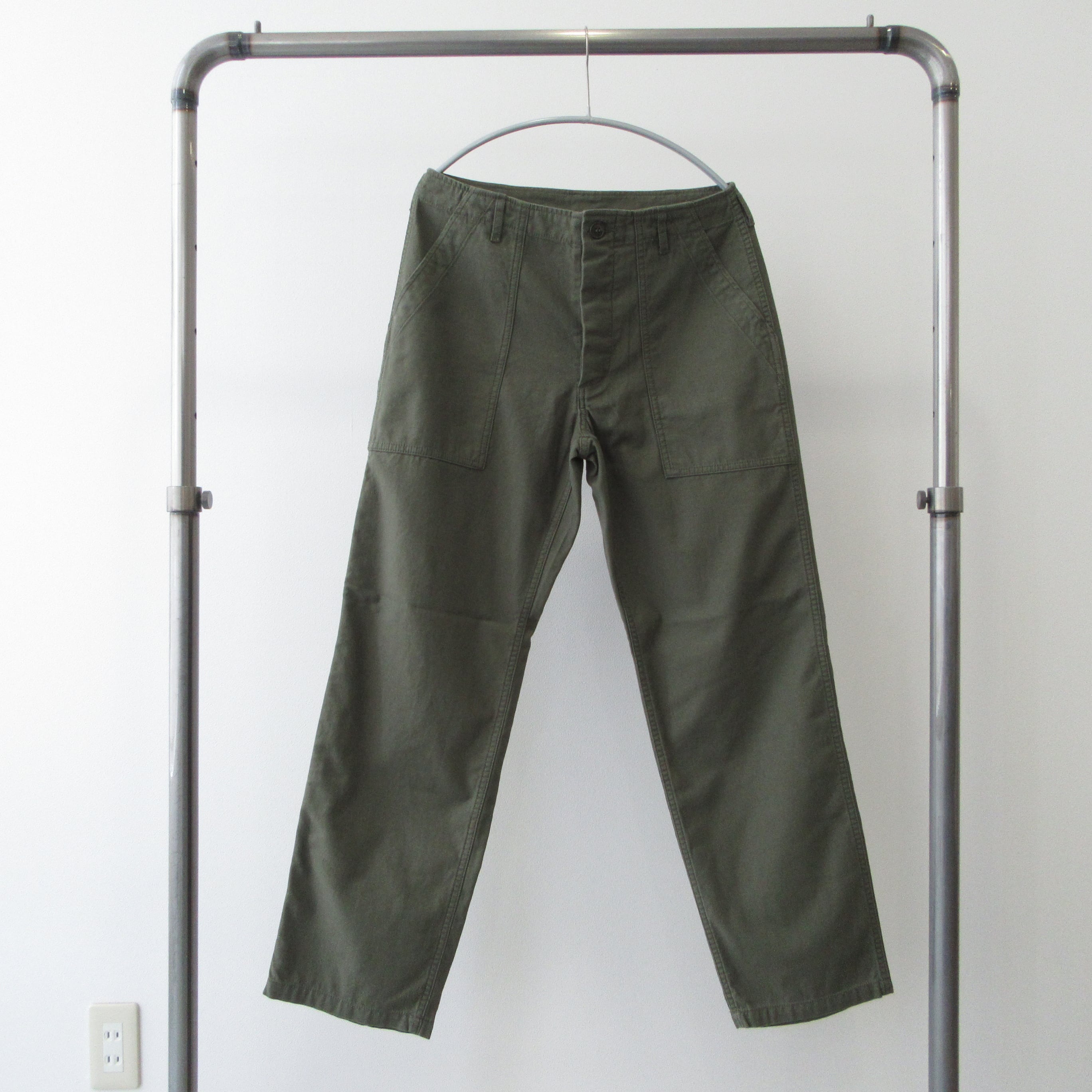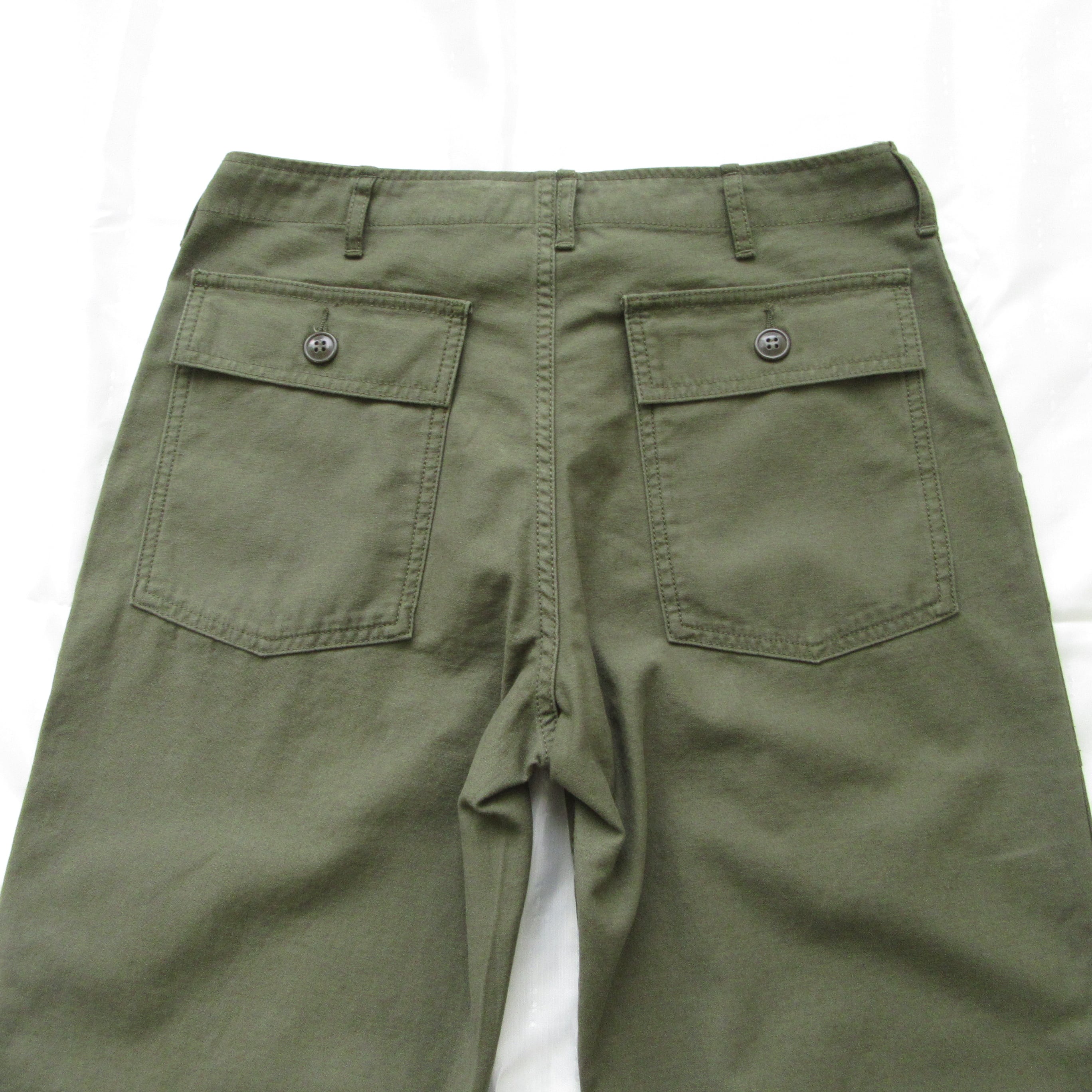 フロントの大きなポケットとフラップ付きのバックポケットが特徴のファティーグパンツ、ボタンフライの初期型といわれる仕様になっています。