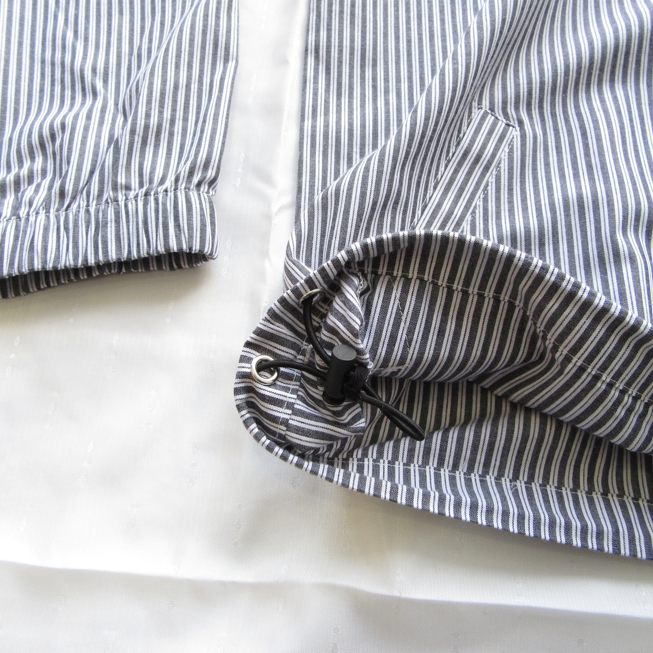 裾の内側左右にはスピンドルが付いておりシルエットの調整も可能で、インナーやパンツとの相性でシルエットを調整できるようになっています。