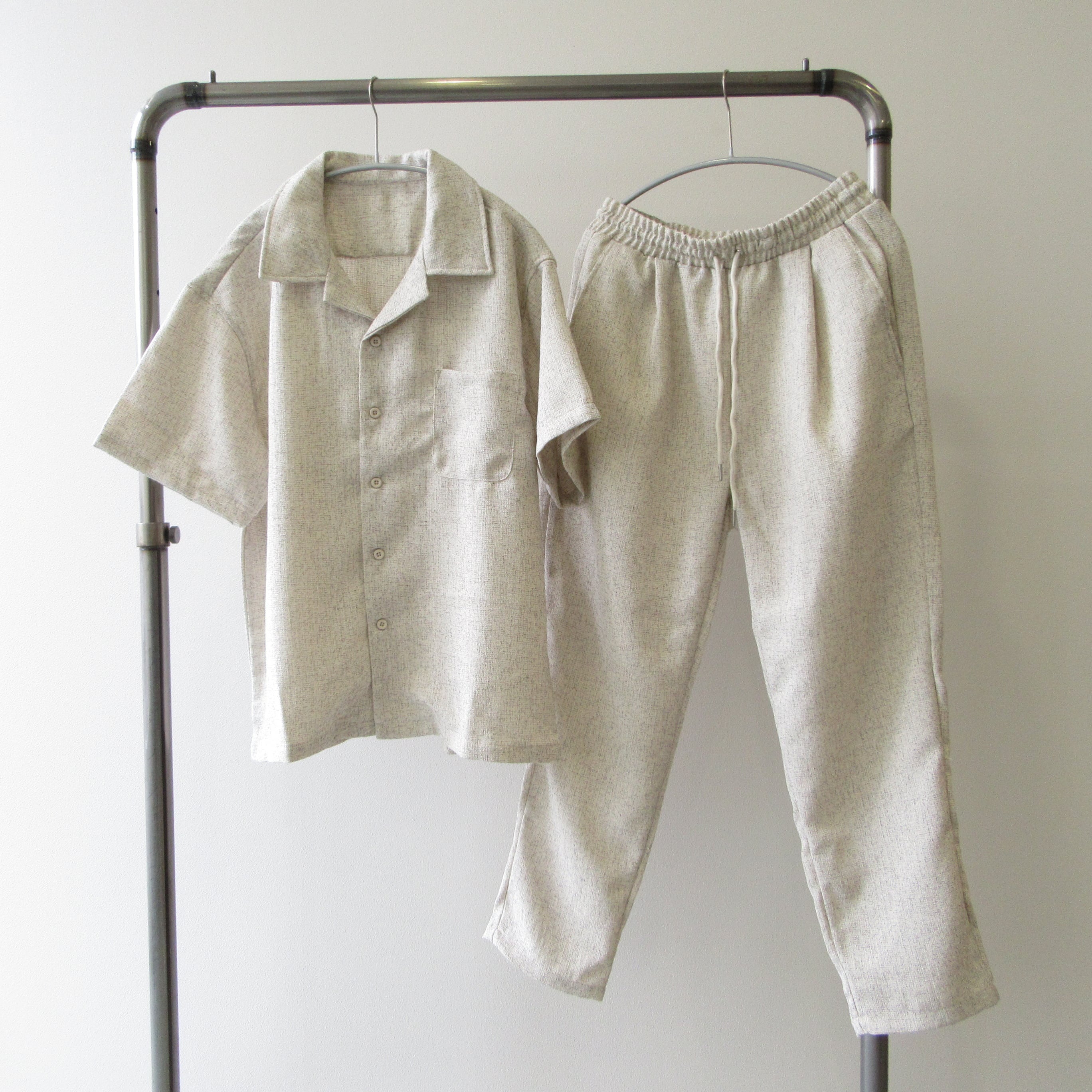 シャツ・パンツ共にリラックスして着用できつつもだらしなく見えない絶妙なサイズ感に設定。春夏におすすめの大人のリラックスセットアップとなっています。