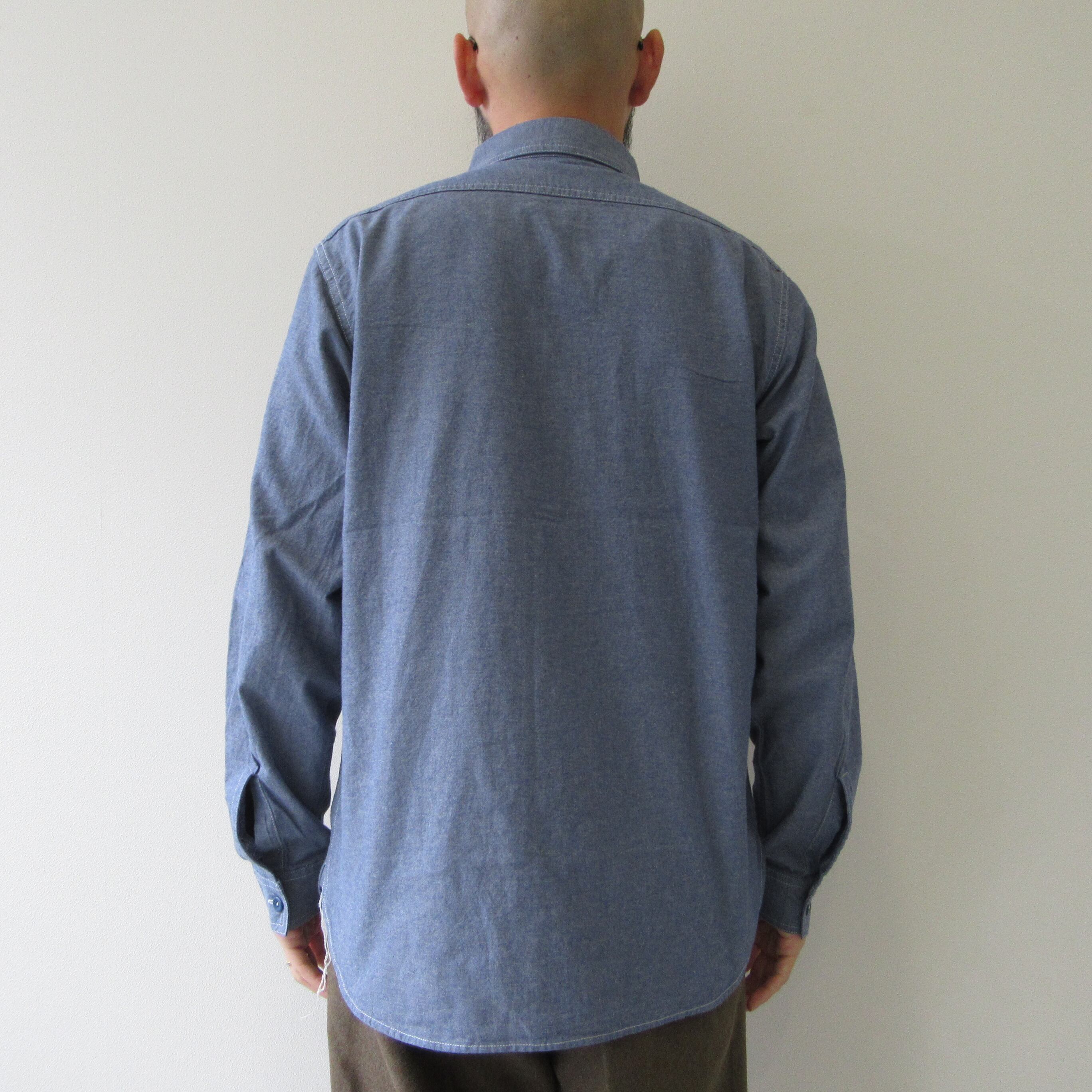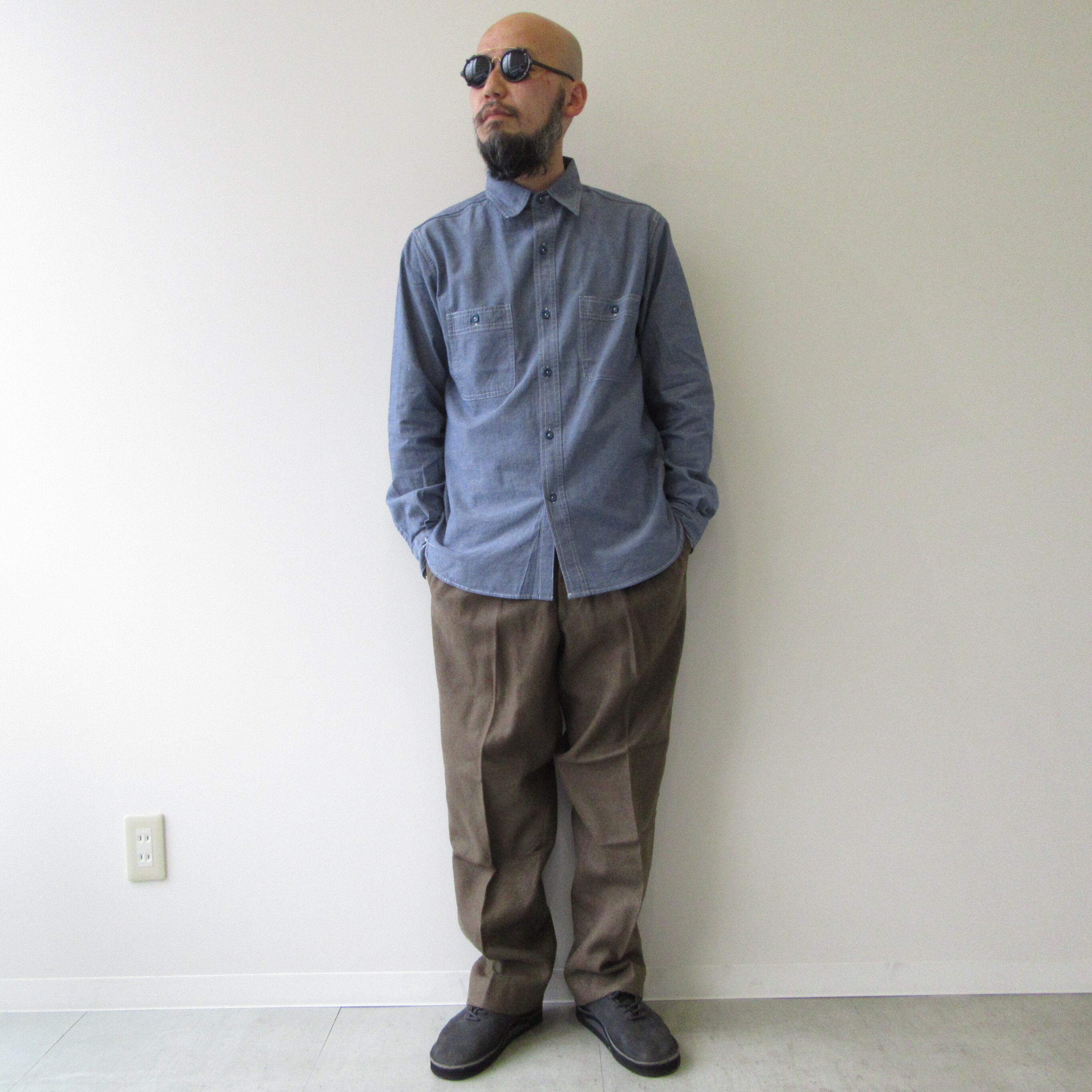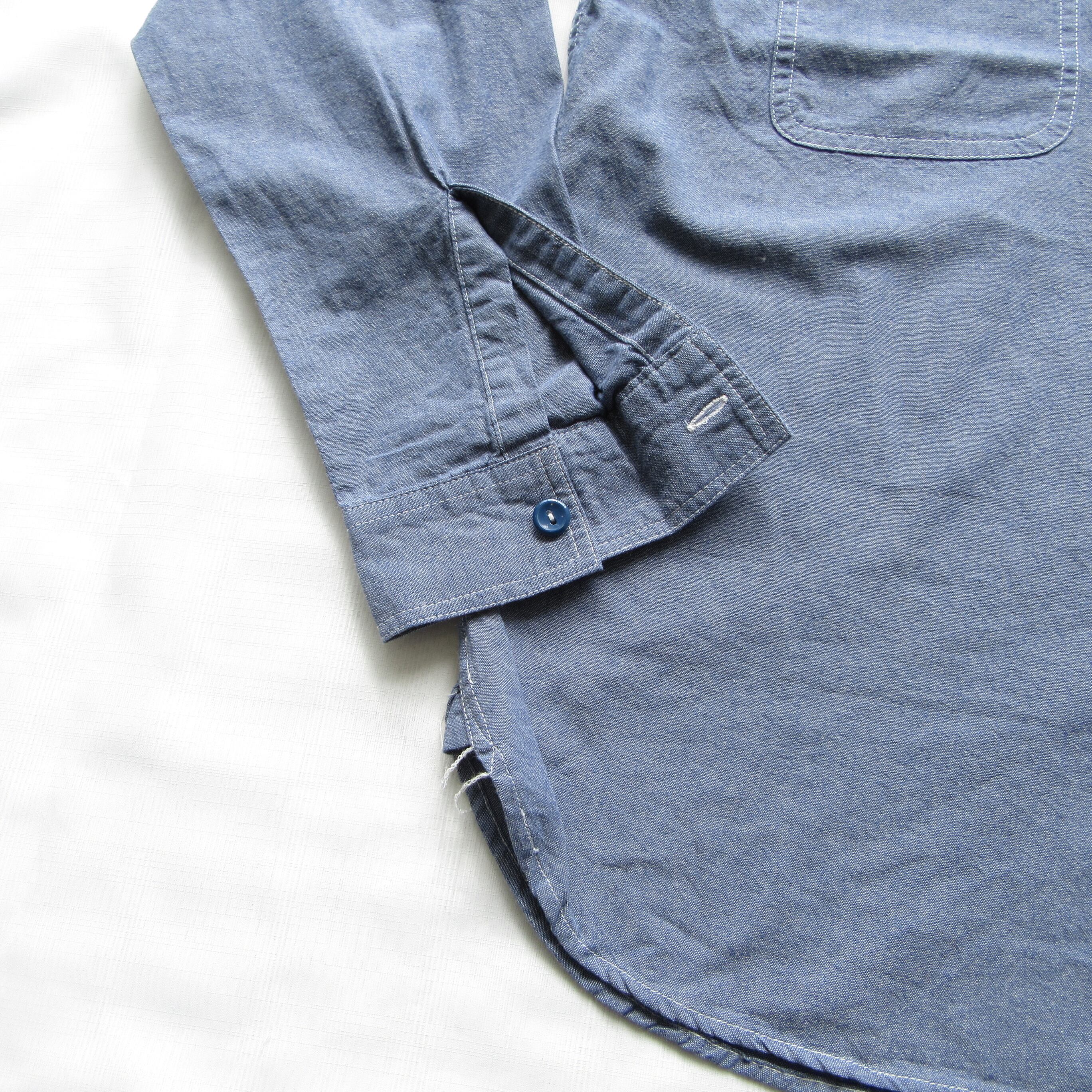 生地と同色のボタンを使った仕様や裾のマチや空環仕上げなどワークシャツらしいディティールに仕上げています。